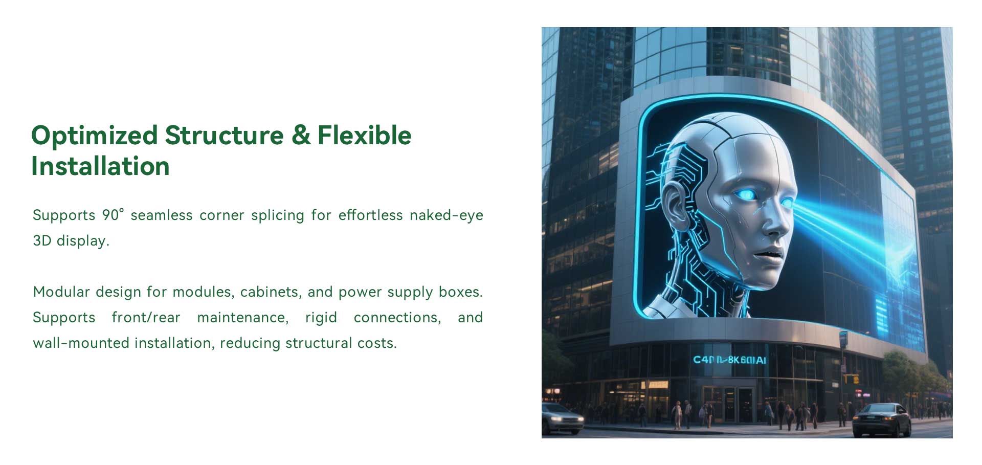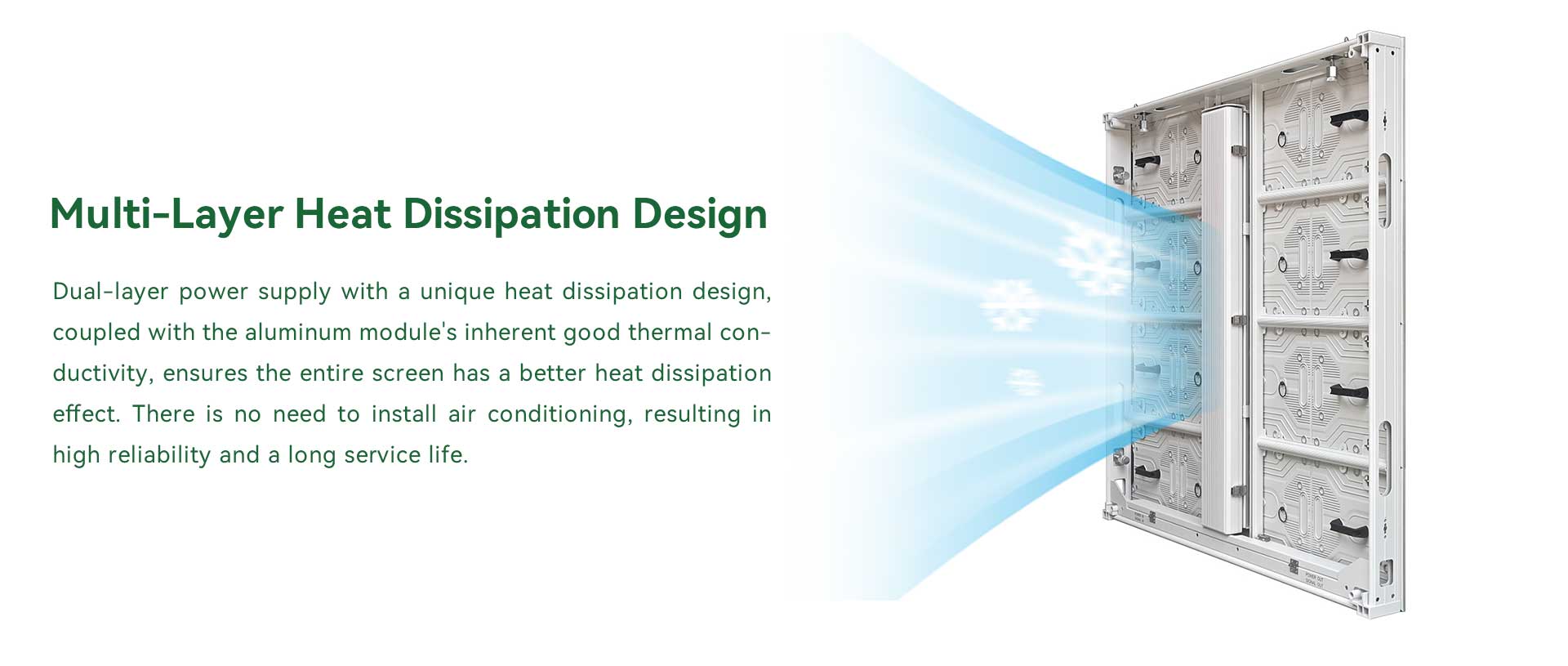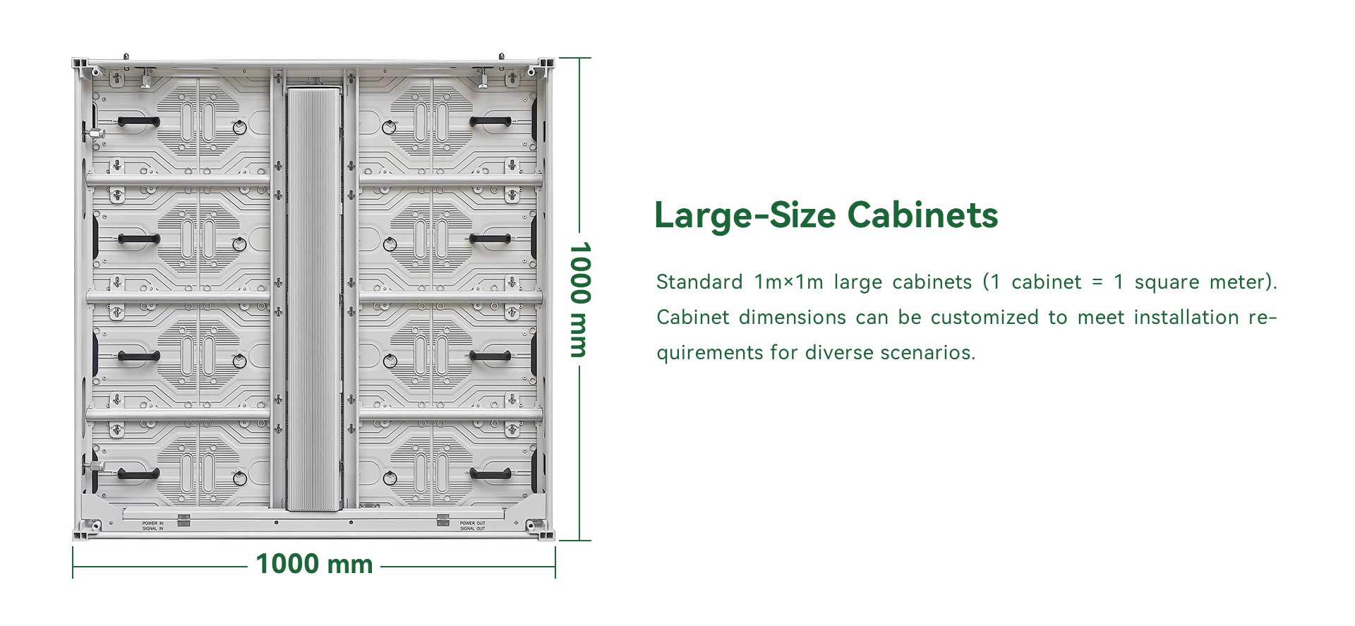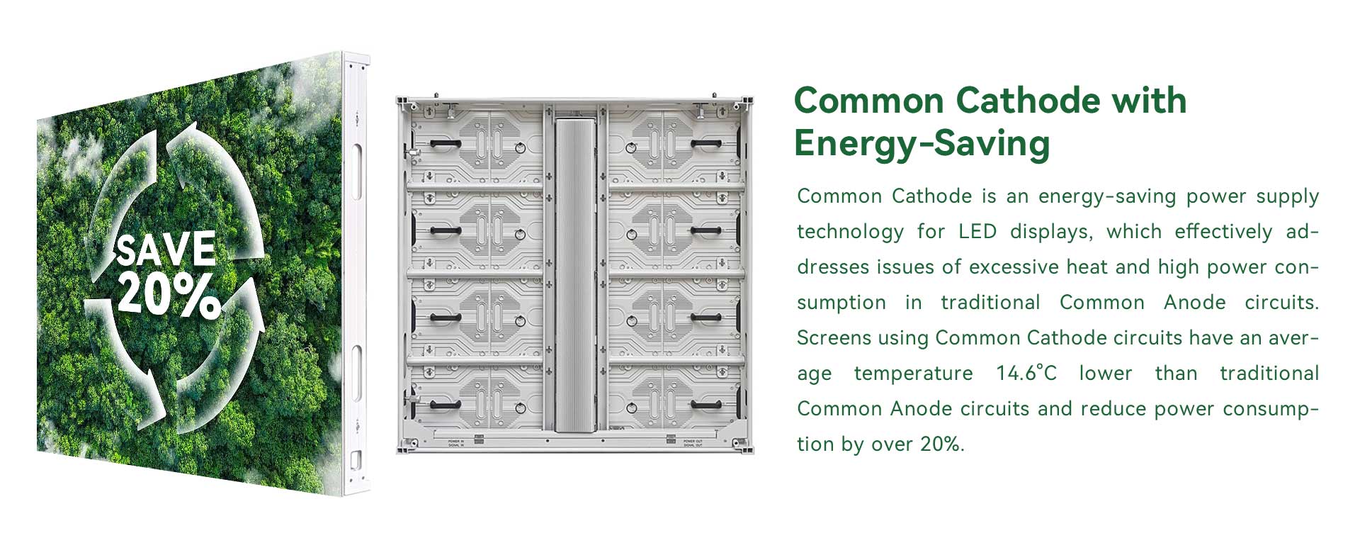 The common cathode energy-saving cold aluminum screen is a new generation of outdoor LED display. It adopts common cathode energy-saving technology and four-level energy-saving technology, which can reduce the average temperature by 14.6°C and power consumption by more than 20%, and further reduce consumption by optimizing the current path, etc. Its all-aluminum cabinet structure is lightweight (20% lighter than traditional iron cabinets) and has high flatness. The large-size cabinets support customization, and the optimized structural design facilitates installation and maintenance. The multi-layer heat dissipation design ensures stable operation. It is suitable for various scenarios such as advertising media, sports events, municipal construction, and transportation hubs.